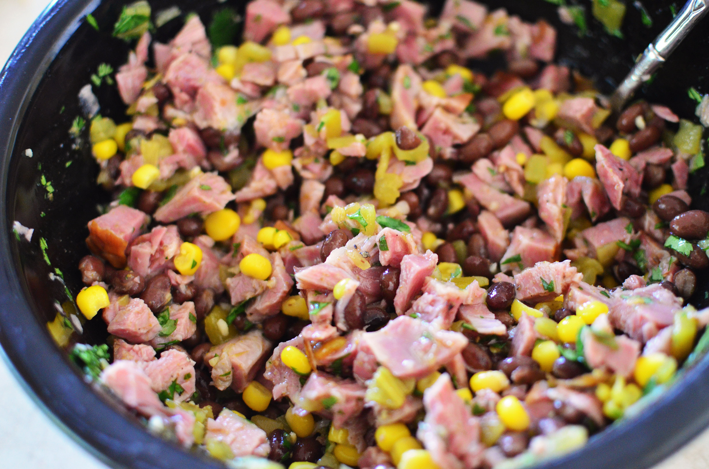 In a large bowl, combine your turkey, beans, green chilies, corn, salsa, and seasonings.