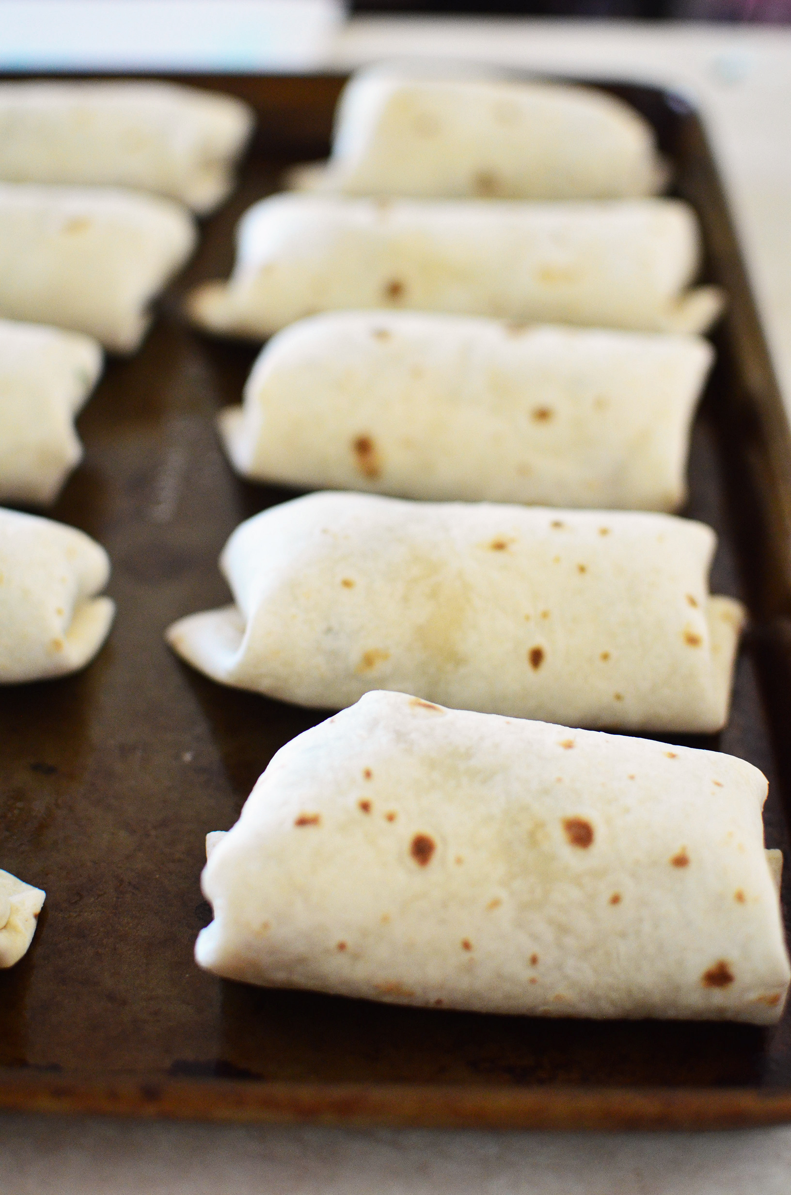- Place about ⅛ cup filling onto each tortilla. Then, roll up once from bottom, fold in sides, then roll up remaining from bottom. Place seam-side down, onto prepared cookie sheet.