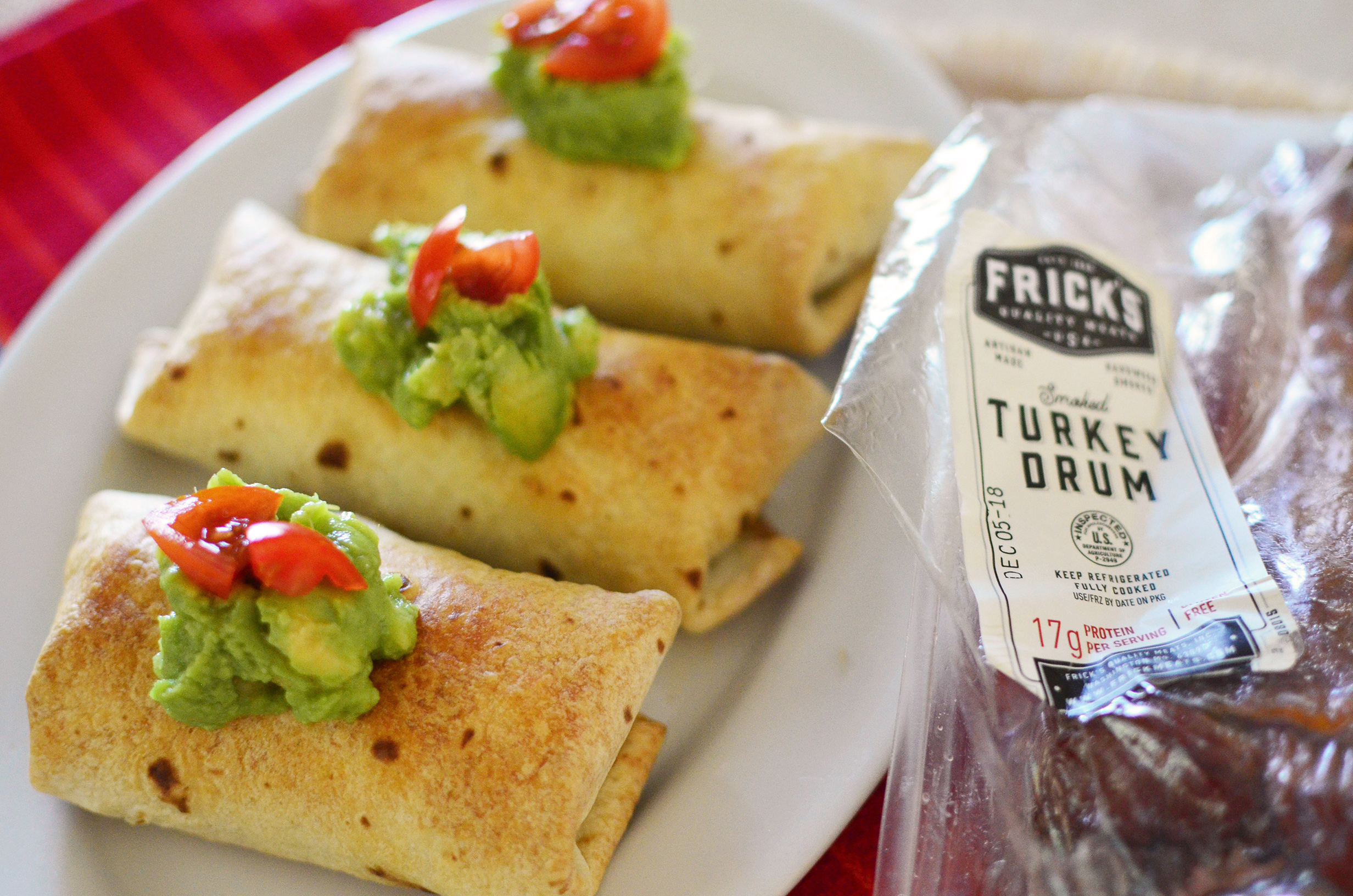 Having tried the turkey drum and ham, I can attest that they are, indeed, frickin’ good. So if you thought these Baked Turkey and Black Bean Chimichangas were made with ground turkey that you have to cook before assembling these beauties, you’d be wrong. Because what makes these so quick is the fact that Frick’s Turkey Drums are PRECOOKED. All you have to do is cut the meat off the bone. It’s that simple! The constantly exhausted mama of three in me is giddy with glee over that alone. For this recipe, I used one of the drums in the package, which was perfect for 10 chimichangas. If you’re having a party or would like to make extra chimichangas for leftovers (which are AMAZING, BTW), you can use both drums and double the recipe.
