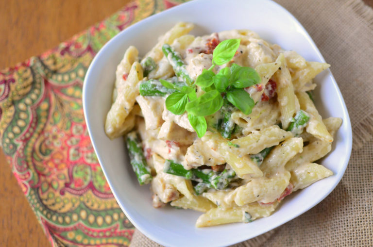 Chicken Penne with Sun-Dried Tomato Sauce is penne tossed with chicken, asparagus, and a creamy and delicious sun-dried tomato sauce. It takes just 25 minutes from start to finish—perfect for a busy weeknight!