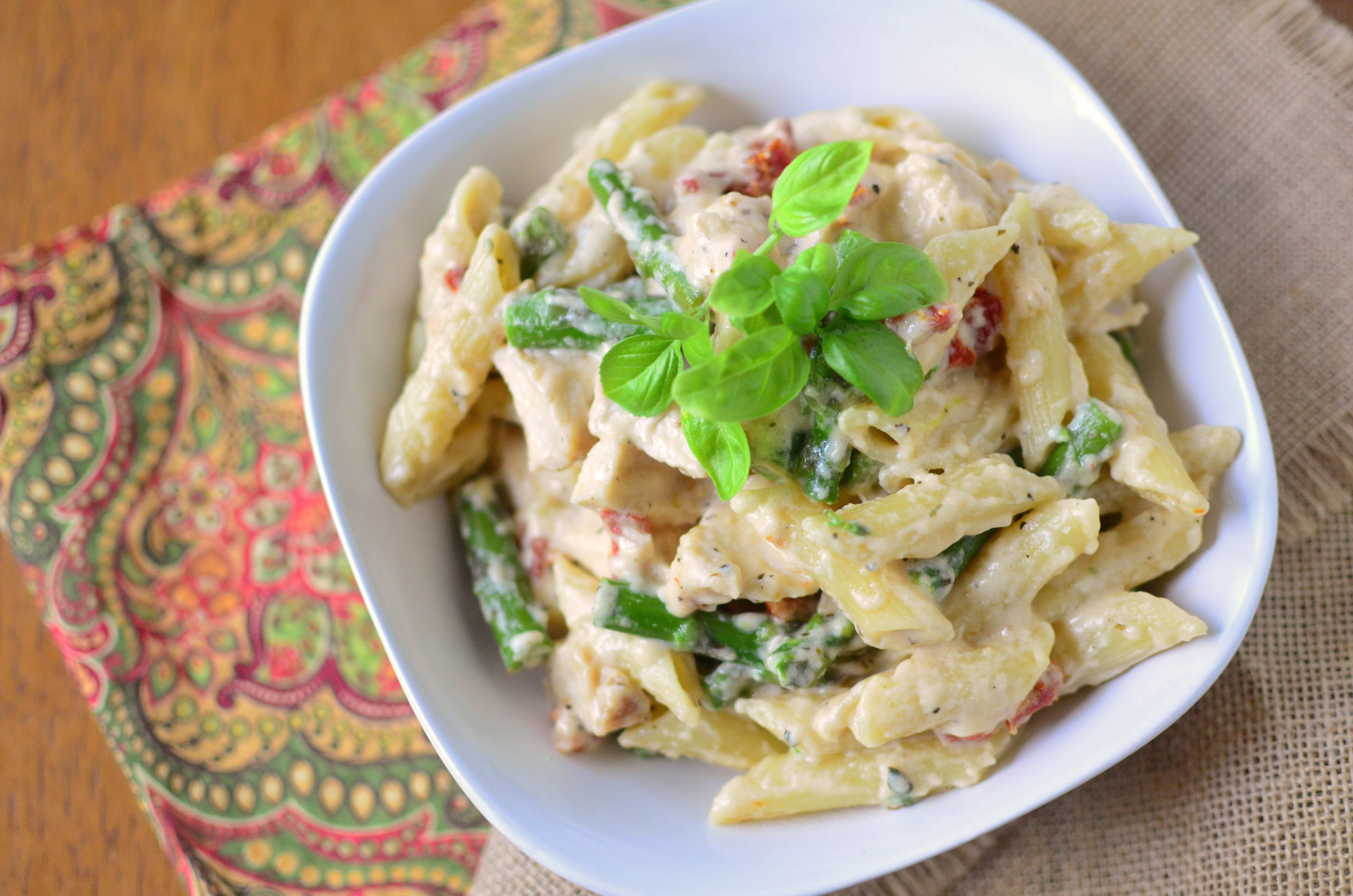 - Combine pasta and asparagus mixture, chicken, and sun-dried tomato sauce in a large bowl. Stir until sauce is fully incorporated. Top with chopped fresh basil.