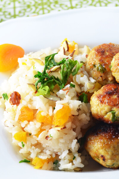 Curry Chicken Meatballs with Apricot Rice Pilaf