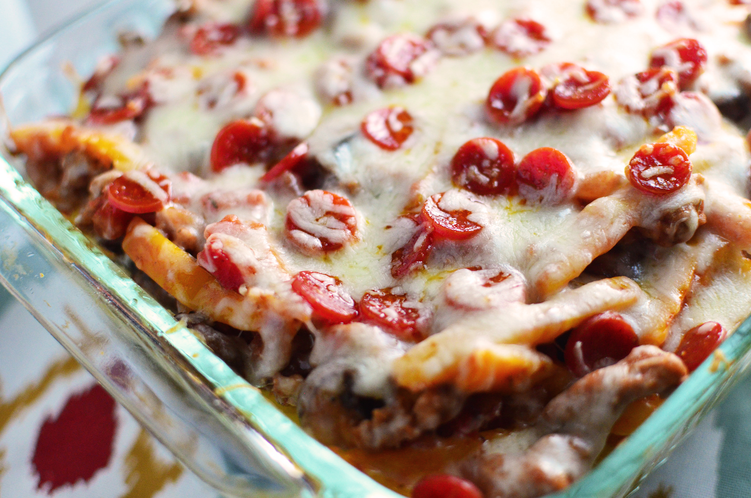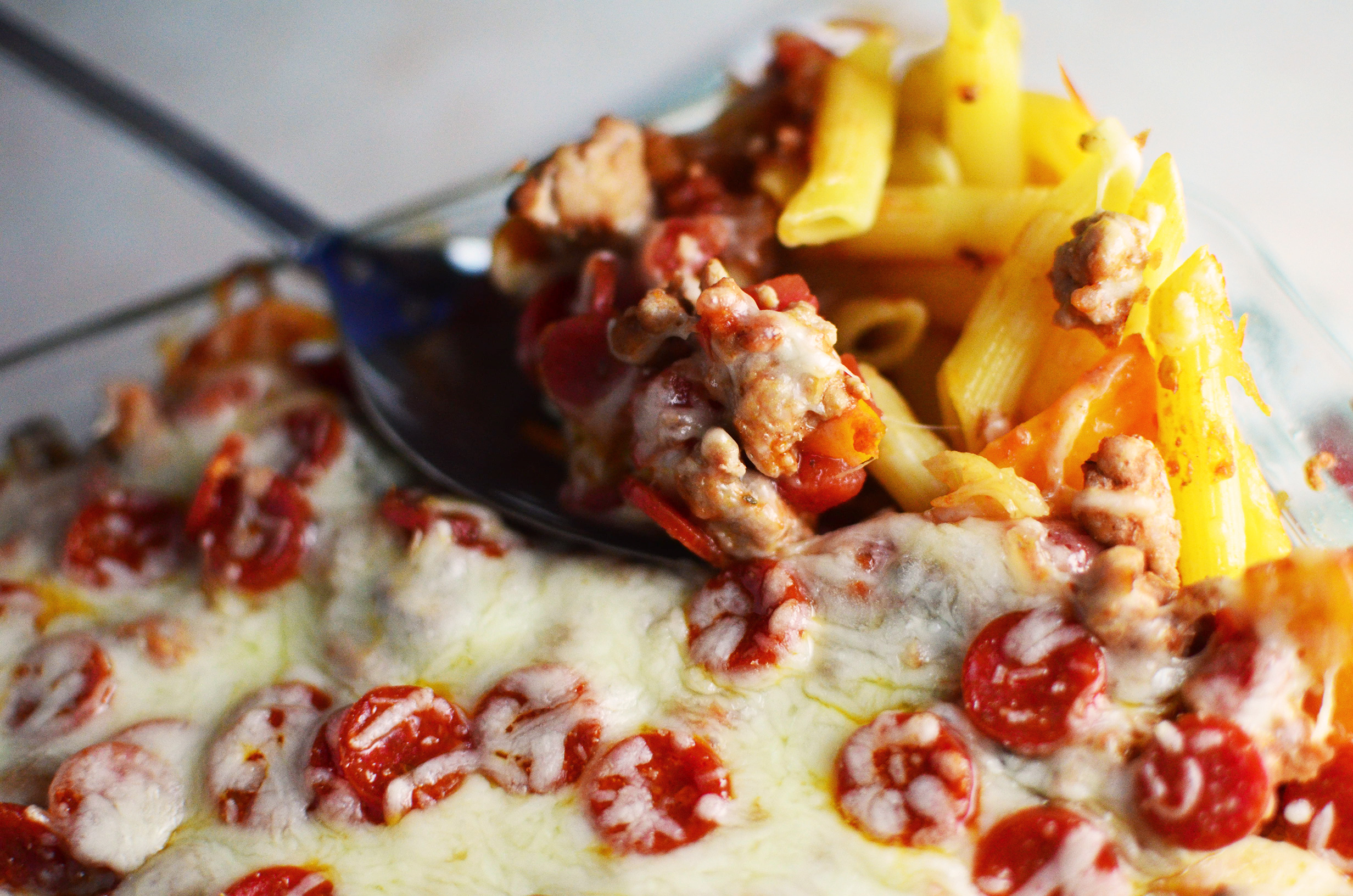 - Spoon sausage mixture over pasta. Sprinkle with mozzarella cheese and mini pepperonis. Bake 10-20 minutes or until heated through and cheese is melted. Enjoy!