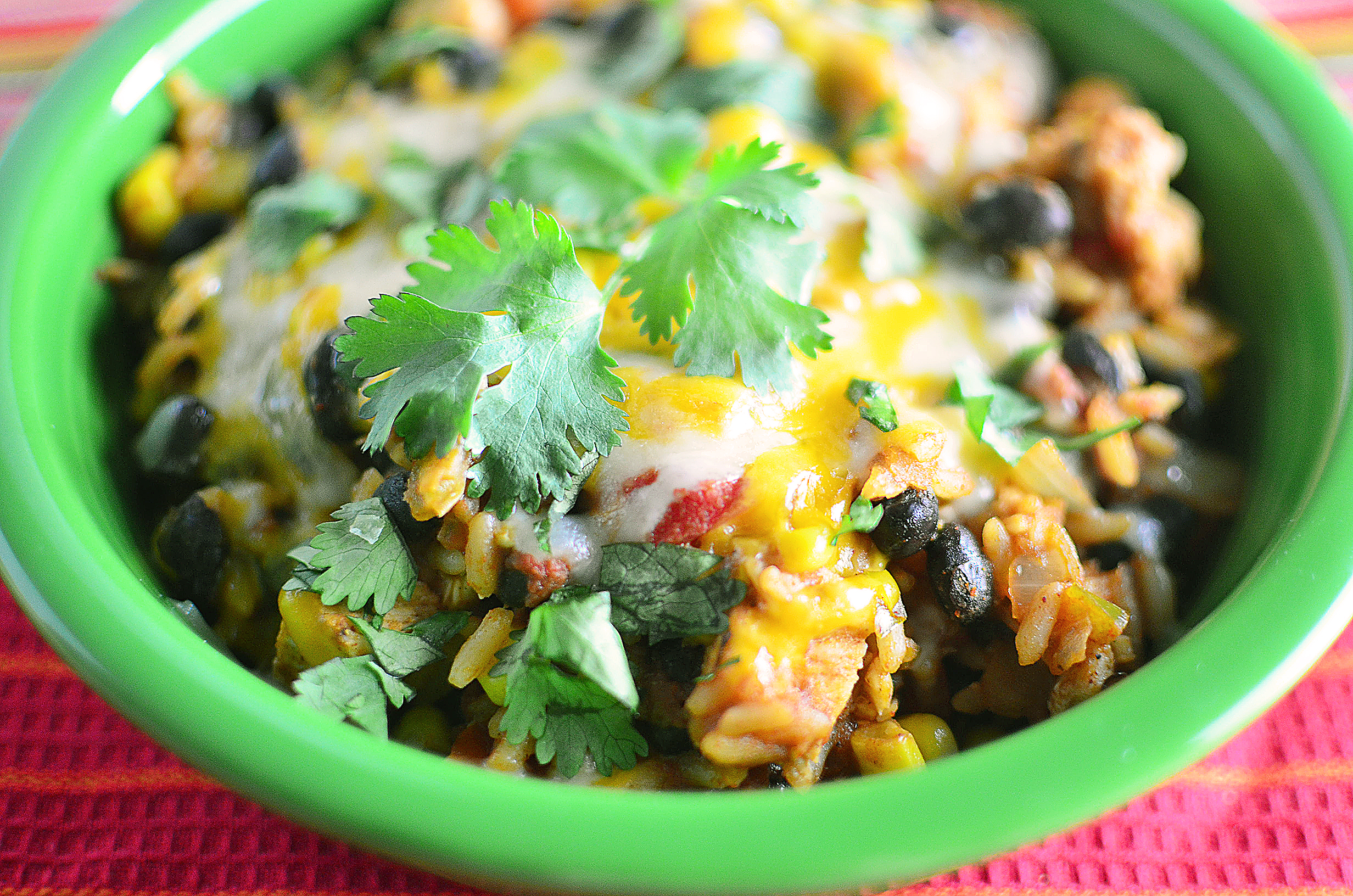 - Cut chicken into bite-sized chunks and add to black bean mixture, along with the rice. Reduce heat to medium-low and allow skillet mixture to simmer until heated through, about 4 minutes.